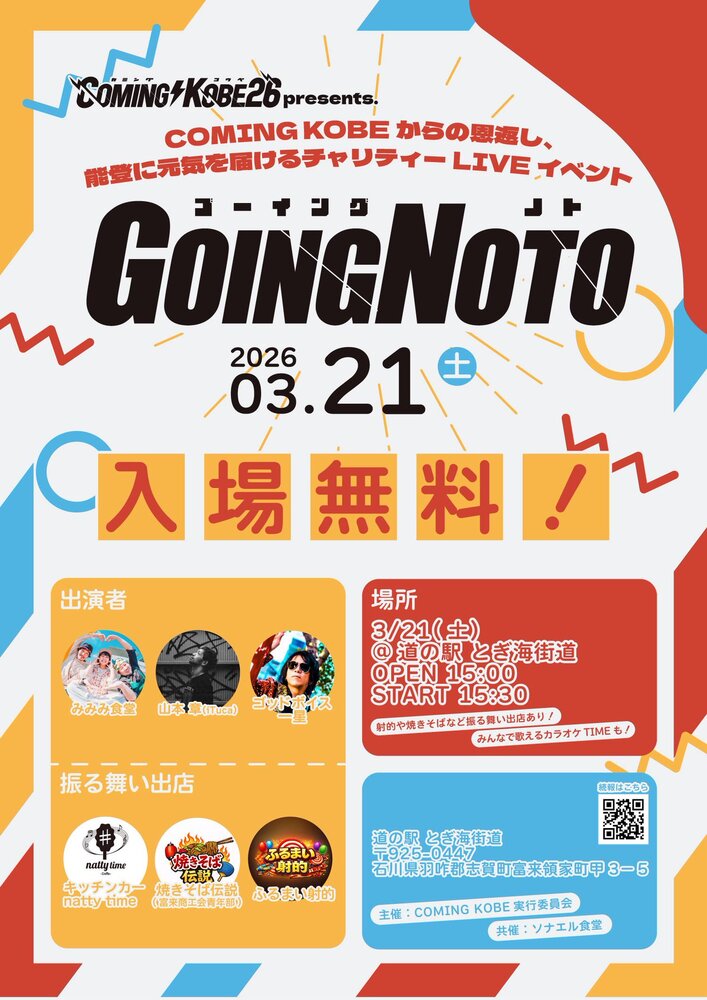 GOING NOTO コンサート 2026/03/21(土) 15:00 - とぎ海街道 地図を表示 東池袋のスターが能登に元気を届けに行くぜ!! みんな能登に行こう! Open 15:00 Start 15:30 Ticket 無料 <Place> 道の駅 とぎ海街道 PV集 URLをコピーする 報告する